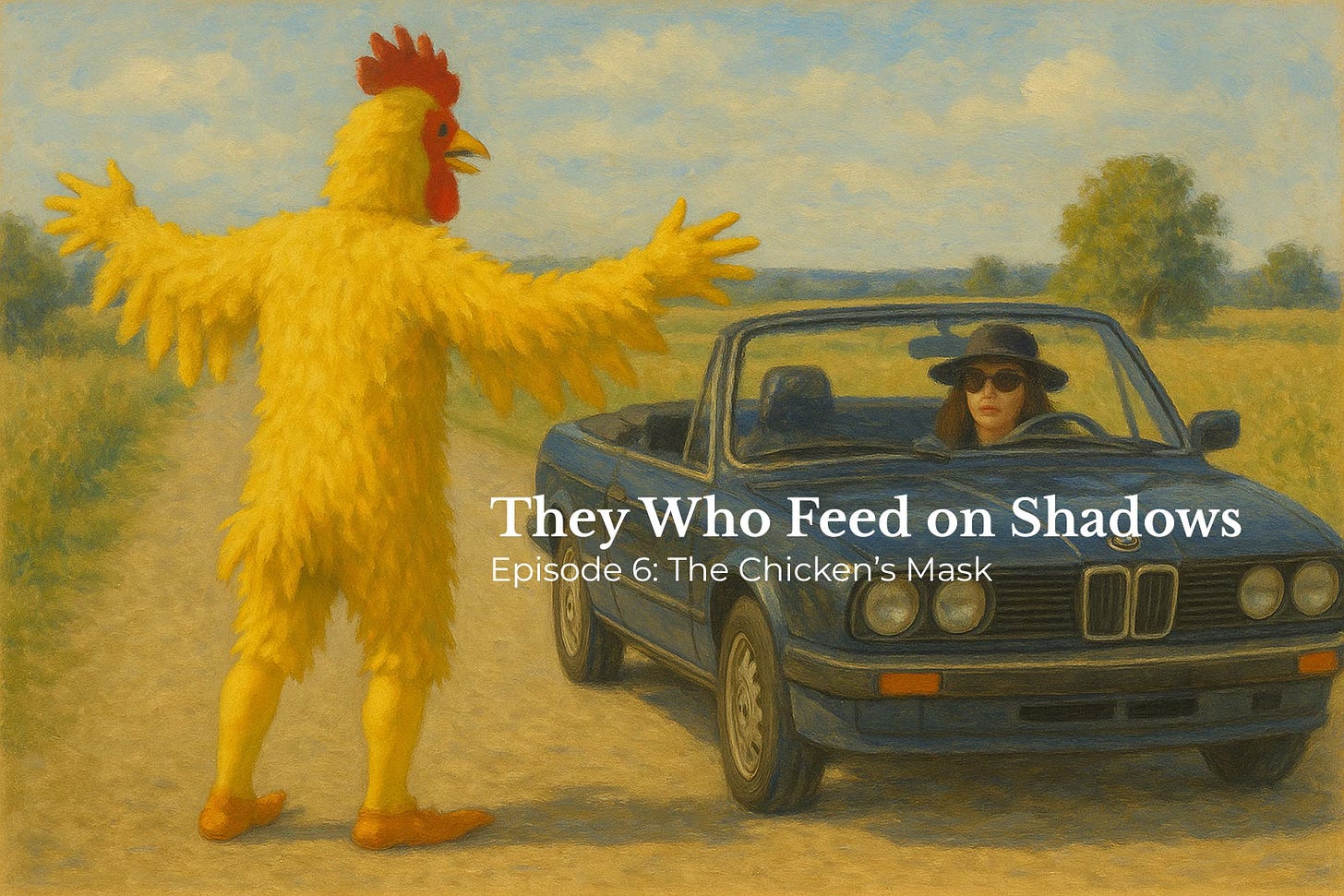 She starts the BMW and jerks her thumb backwards. The trunk pops open. The man inside the chicken visibly deflates, and only now does he remove the head of his costume. The chicken head is huge. He tries to hold it under one arm and almost drops it. His human hair is slicked back and black. I wonder if everything in his life is always this disproportionate. His glasses are thin-framed and hip. His skin is clean-shaven, gleaming pale in the sun, and I imagine that he smells like German cologne as I wait for him to detach his human head and put it in the trunk also.